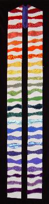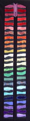 Rainbow stoles are available in a white or a black background. Strips of fabric in the colors of the rainbow are applied down the sides of each stole. The full spectrum (red to violet) runs down each side on black or white background. Spectrum runs continuous (from one side to the other) on black silk background. |